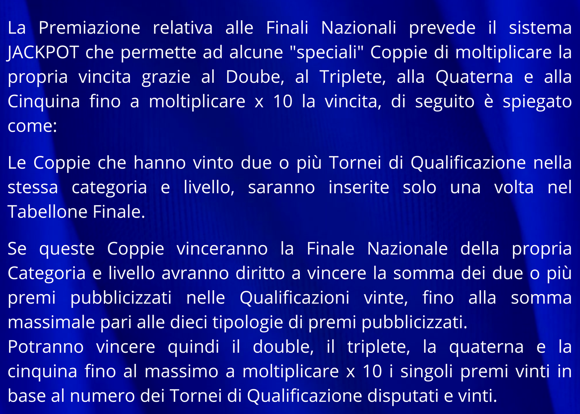 Tutte le singole Coppie inserite nei Tabelloni Finali divisi per Categoria, hanno vinto uno o più Tornei o Circuiti denominati "di Qualificazione" disputati nel proprio Club, nella propria città e regione.