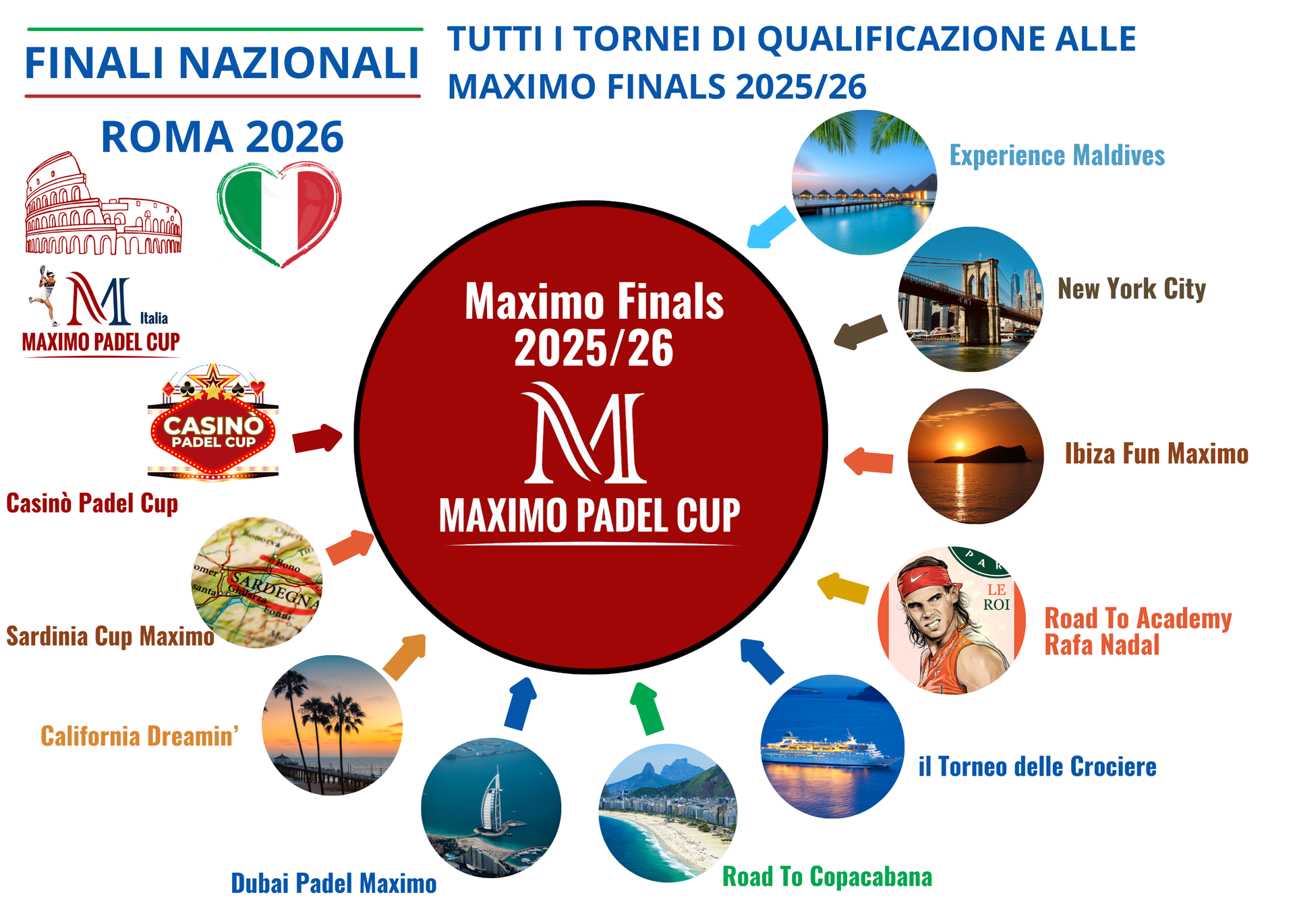 Il Master Finale denominato Maximo Finals o Finali Nazionali, rappresenta l’ultimo atto degli eventi organizzati dalla Società Maximo Padel Cup e coinvolge tutte le migliori Coppie dei tornei di qualificazione da essa organizzati o proposti nella Stagione Sportiva 2025/26 eleggendo la Coppia Campione d'Italia del Padel Amatoriale per ogni categoria e livello.